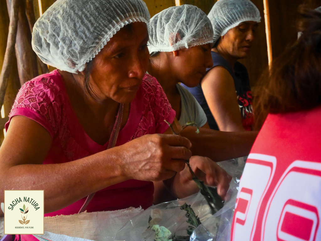 La jornada contempló el corte, picado y formulación de la mezcla bajo la guía de las sabias abuelas, con el acompañamiento técnico de Sacha Natura, que tradujo las proporciones tradicionales a medidas estandarizadas para asegurar su replicabilidad. Luego se realizó un segundo picado más fino y se procedió al llenado manual de filtrantes para infusiones, una de las formas de consumo más populares y comercializadas a nivel global.