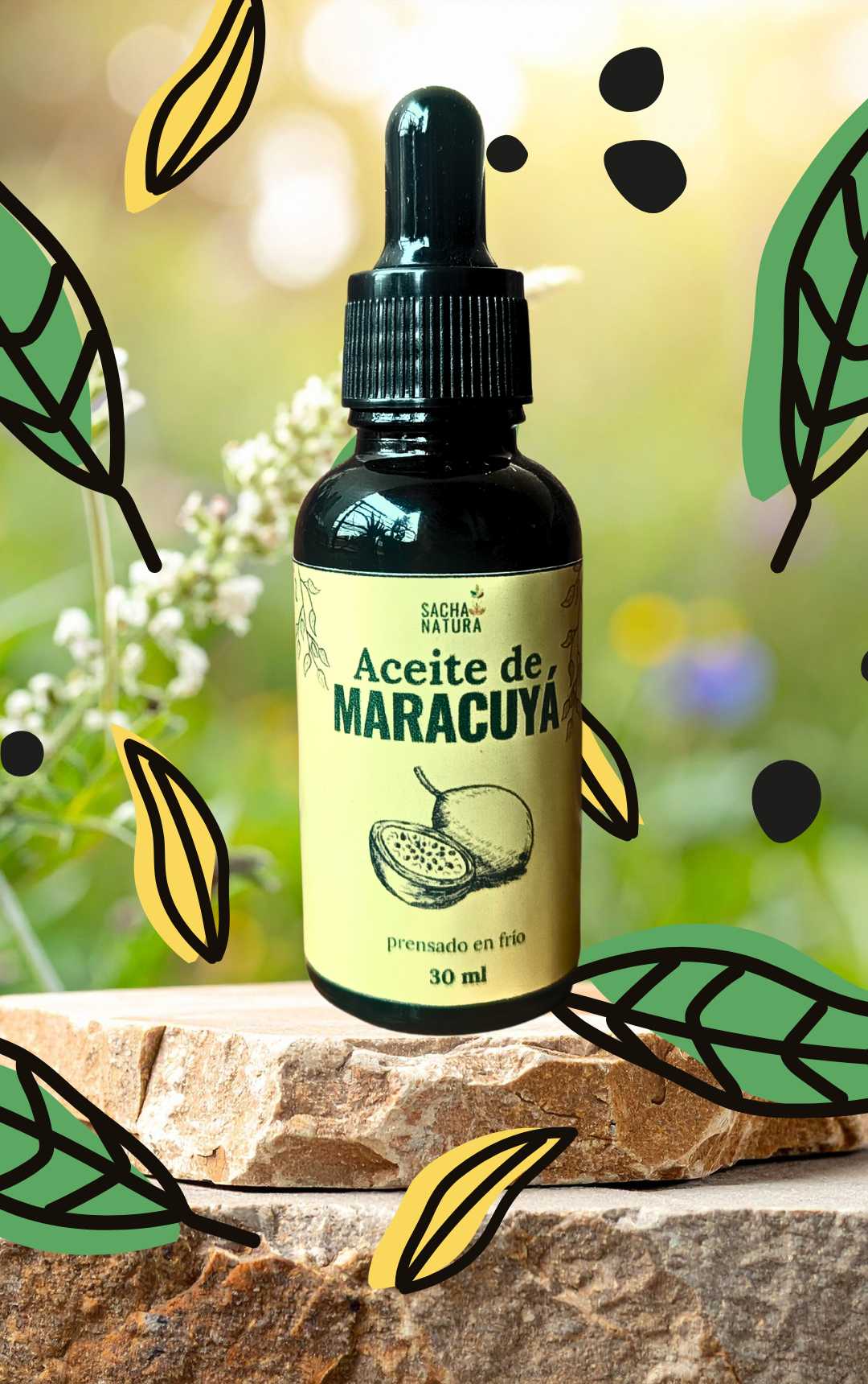 Aceite vegetal de maracuyá 100% puro (Passiflora edulis), extra virgen prensado en frío.